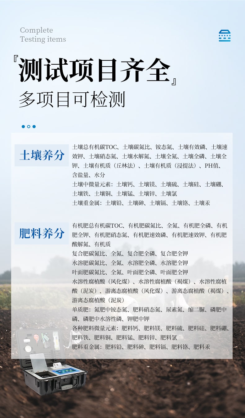 2、肥料養(yǎng)分:●有機肥總有機碳TOC、有機肥碳氮比、全氮、有機肥全磷、有機肥全鉀、有機肥硝態(tài)氮、有機肥速效磷、有機肥速效鉀、有機肥酸解氮、有機質(zhì);●復(fù)合肥碳氮比、全氮、復(fù)合肥全磷、復(fù)合肥全鉀;●水溶肥碳氮比、全氮、水溶肥全磷、水溶肥全鉀;●葉面肥碳氮比、全氮、葉面肥全磷、葉面肥全鉀;●水溶性腐植酸(風化煤)、水溶性腐植酸(褐煤)、水溶性腐植酸(泥炭)、游離態(tài)腐植酸(風化煤)、游離態(tài)腐植酸(褐煤)、游離態(tài)腐植酸(泥炭);●單質(zhì)肥:氮肥中銨態(tài)氮、肥料硝態(tài)氮、尿素氮、縮二脲、磷肥中磷、磷肥中水溶性磷、鉀肥中鉀;●各種肥料微量元素:肥料鈣、肥料鎂、肥料硫、肥料硅、肥料硼、肥料鐵、肥料銅、肥料錳、肥料鋅、肥料氯;●肥料重金屬:肥料鉛、肥料砷、肥料鎘、肥料鉻、肥料汞。