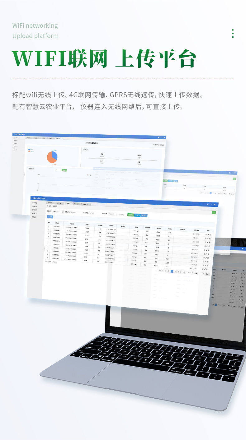 ★10、配有智慧云農業平臺,儀器連入無線網絡后,可將檢測數據可選擇性或批量無線上傳,方便用戶進行數據管理和長期分析。