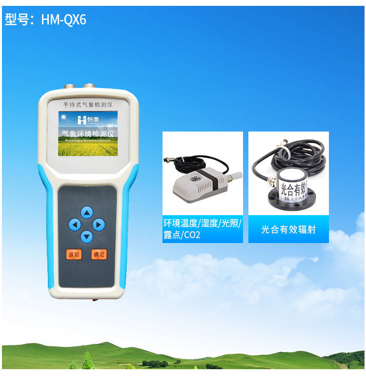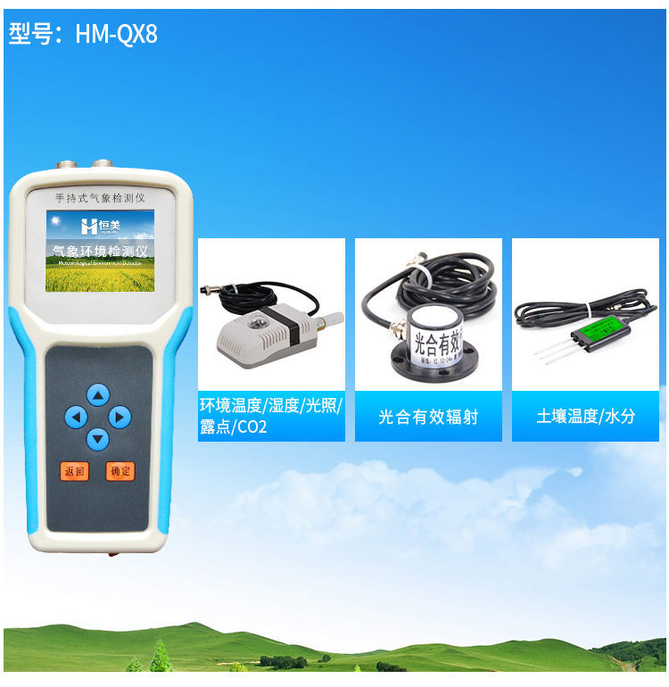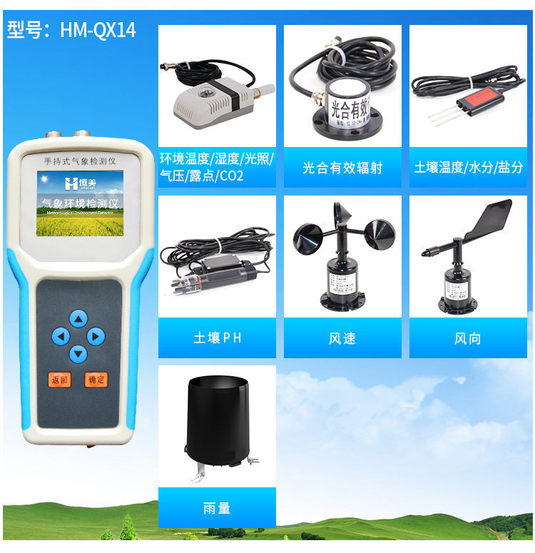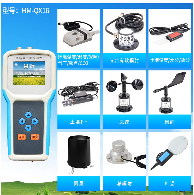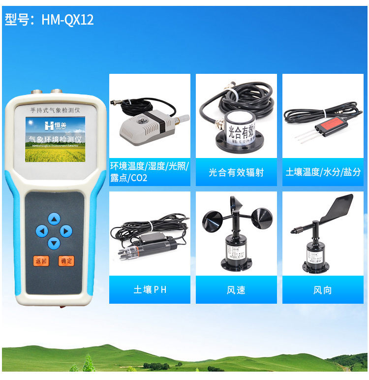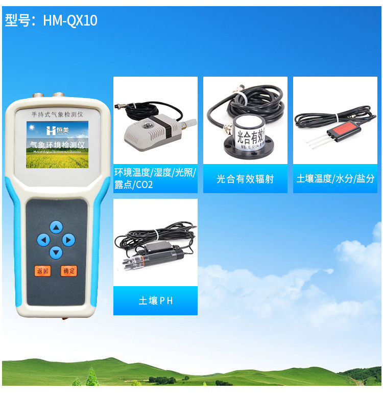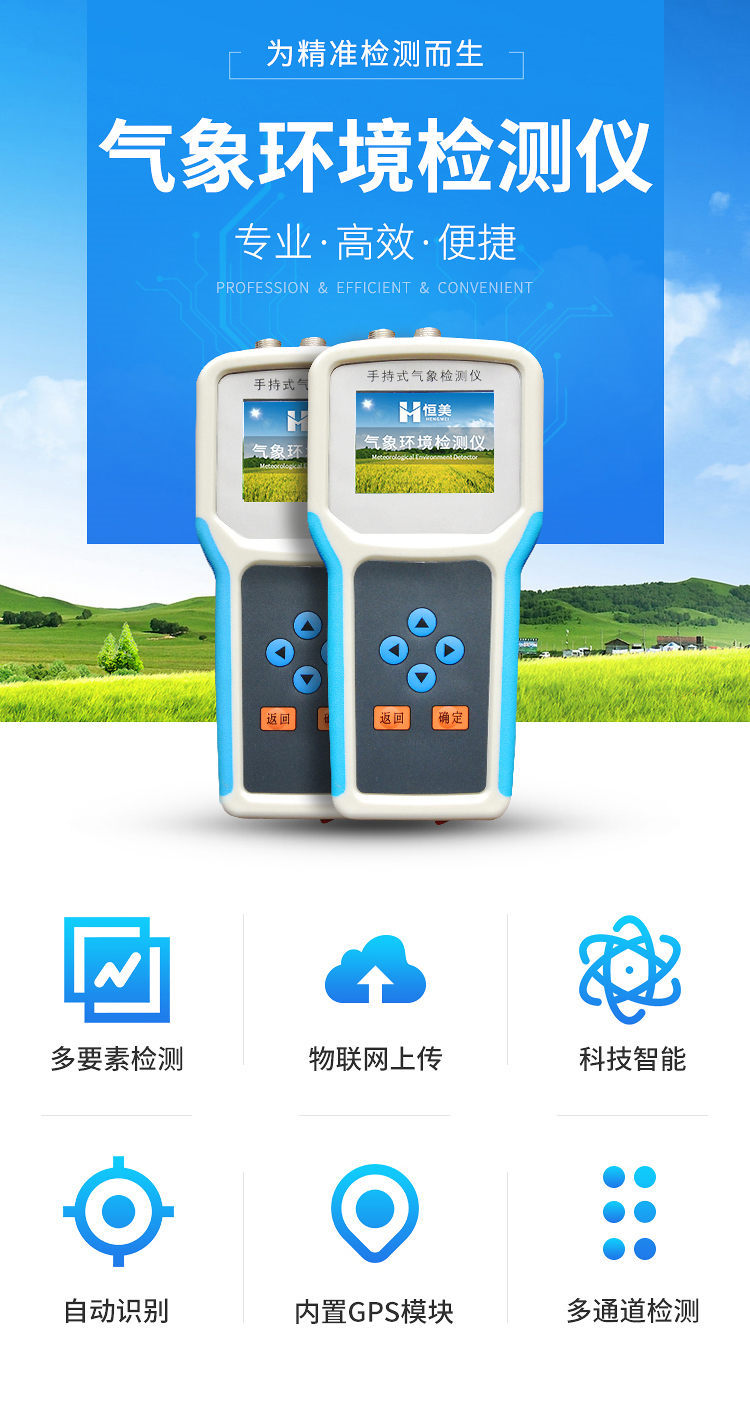 手持式智能農業氣象環境檢測儀是我們專門針對農田、草場局部小尺度環境設計的,對與植被和農作物生長密切相關的土壤、水氣等環境參數監測的農田小氣候站。它主要觀測與農業相關的空氣溫度、空氣濕度、光照強度、二氧化碳濃度、露點溫度、光合有效輻射、土壤溫度、土壤濕度、土壤鹽分、土壤PH等10個環境參數氣象要素,為農業科研、農業生產等提供良好的支持。